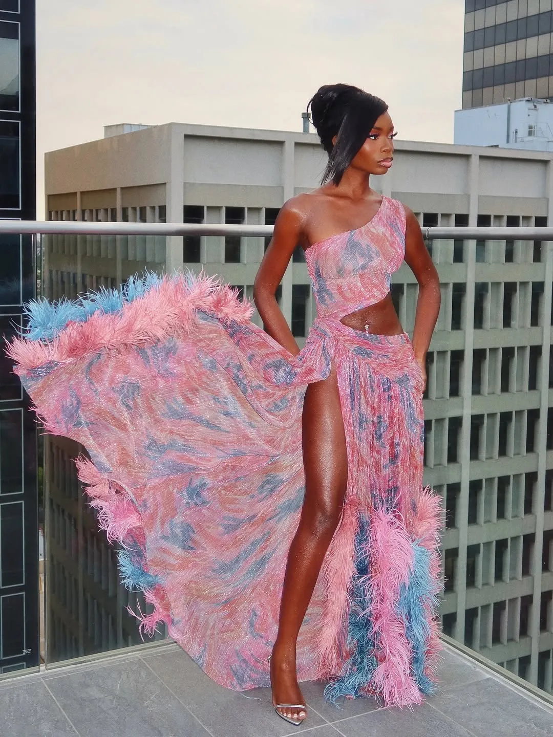 A one-shoulder cutout two-piece in a sheer, metallic-threaded fabric printed in a swirling mix of coral pink and slate blue, with a cropped bandeau-style top and a floor-length wrap skirt that opens into a dramatic high slit. The hem is finished with a dense fringe of ostrich feathers in matching pink and blue tones, adding an extravagant sweep to the base of the look that makes it feel simultaneously beach-luxe and red carpet. Clear heeled sandals keep the focus on the outfit.