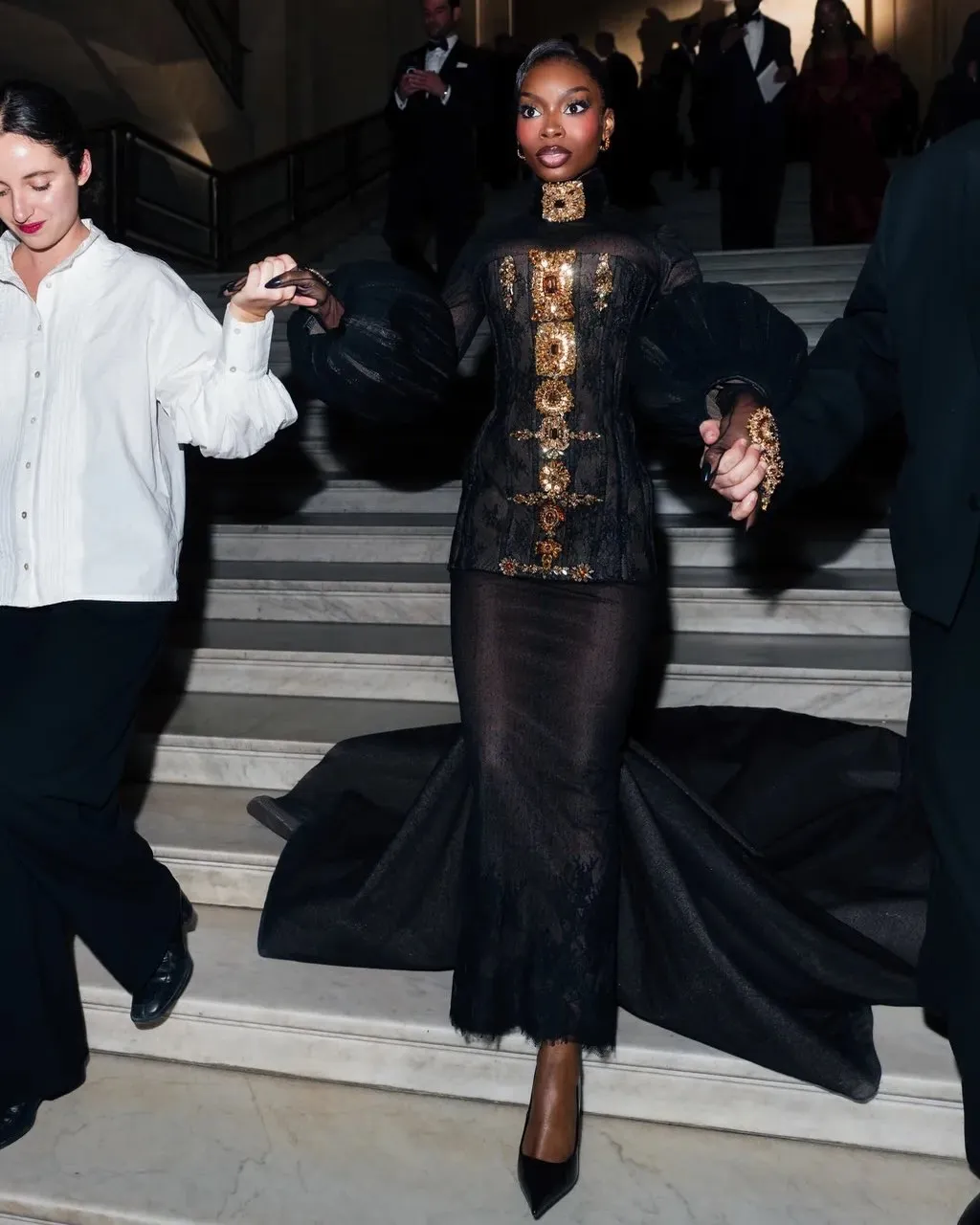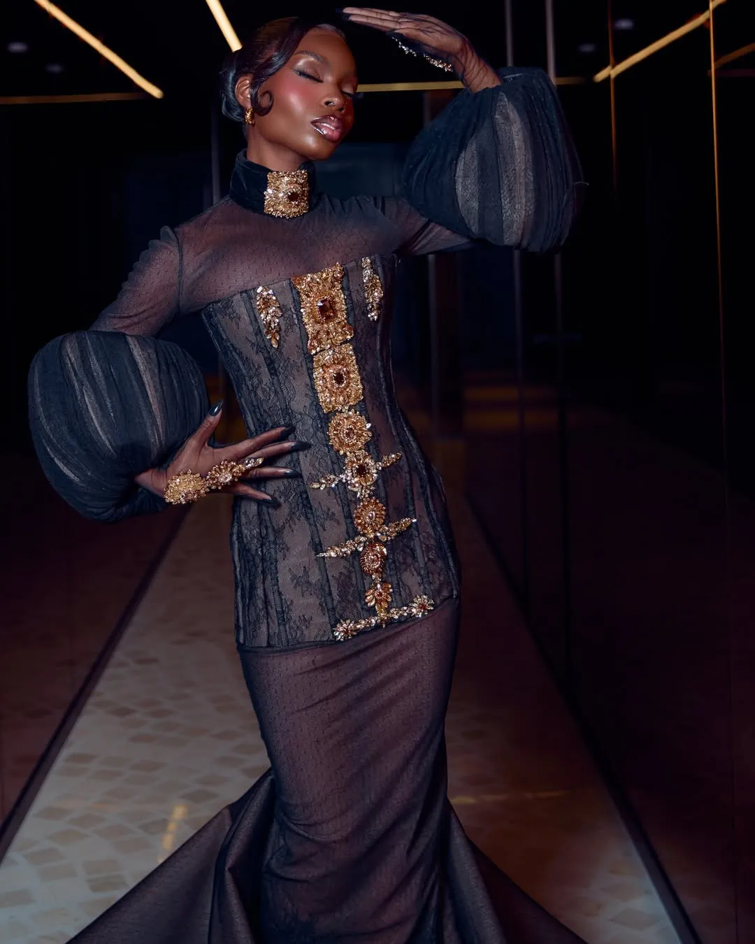 Black lace high-neck structured jacket with a vertical column of ornate amber and gold jewelled brooches from collar to waist, dramatic puff sleeves with matching gem cuff embellishments, and a coordinating sheer black lace mermaid skirt with cathedral train. Black pointed-toe pumps, gold hoop earrings, silver-dusted slicked hair. Renaissance-meets-black-tie — regal, architectural, and breathtakingly ornate.