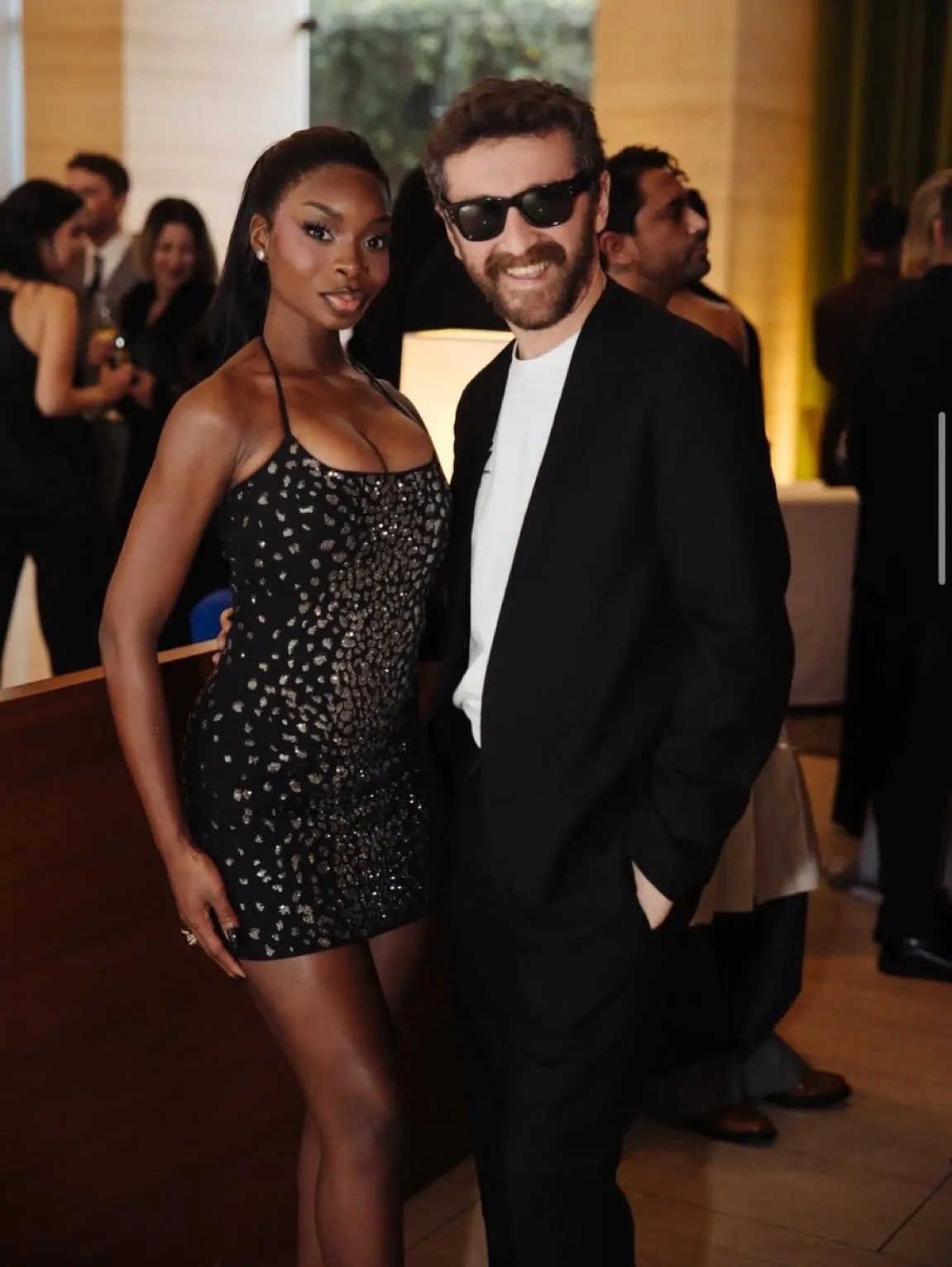 Black halter mini dress scattered with silver sequin or metallic spot embellishment — sleek square neckline, thin halter ties, fitted and barely-there. Black pointed-toe patent stilettos. Pearl stud earrings and a ring. Sleek high ponytail.